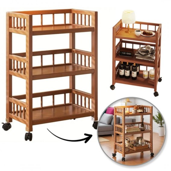 bambusowy regał na kółkach, dzięki któremu łatwo uporządkujesz swoje rzeczy.