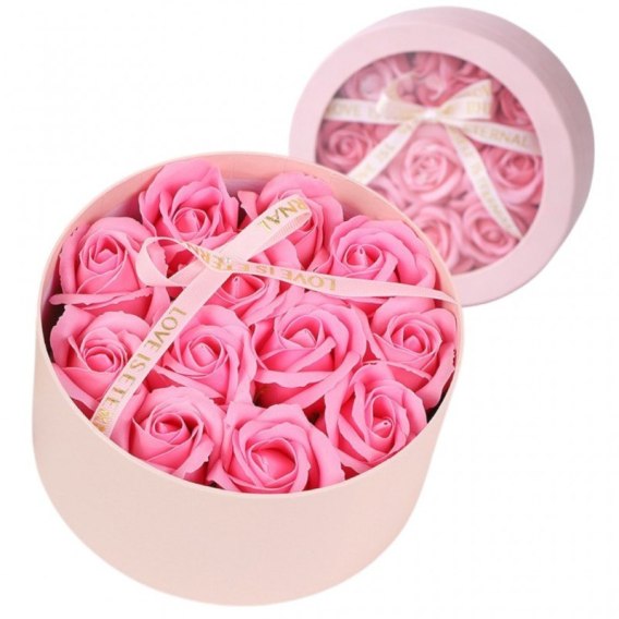 Bukiet zapachowych kwiatów mydlanych w ozdobnym pudełku, różowe róże BUK26R