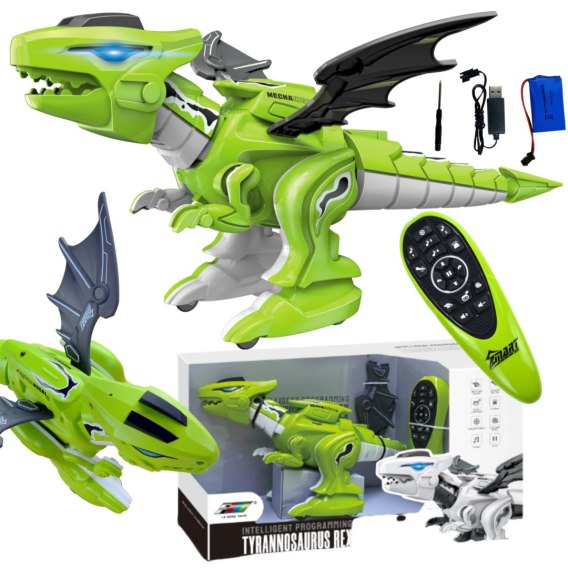 Nasz T-REX różni się od klasycznego gada tym, że posiada skrzydła więc niektórzy mogą go nazywać smokiem! Ogromną zaletą produktu jest fakt, że dinozaur wydaje dźwięki, posiada ruchomą głowę i ogon, a także TAŃCZY do 4 piosenek! Możemy zaprogramować ruchy dinozaura, a takżeodpiąć skrzydła!