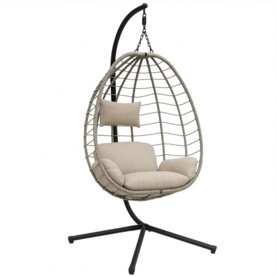 Fotel wiszący huśtawka, kokon składany szary z beżowymi poduszkami KR37SZ