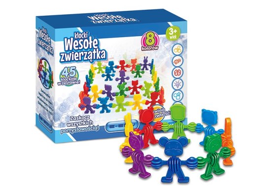 Każde zwierzątko łączy się z drugim łapiąc się za łapki w kolorowym tańcu. Ilość 45 elementów w zestawie daje nam pełną swobodę do działania!