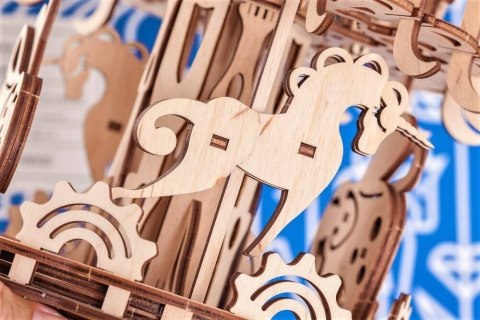 Drewniane puzzle 3D w kształcie karuzeli, wykonane z wysokiej jakości sklejki. Zestawy mają postać arkuszy z wstępnie wyciętymi i ponumerowanymi elementami, które przed montażem, należy oddzielić od wykroju, a następnie połączyć bez użycia kleju, zgodnie ze szczegółową instrukcją dołączoną do opakowania. Dzięki wykorzystaniu nowoczesnej technologii obróbki drewna, karuzelę charakteryzuje duża ilość detali, a jej budowa będzie ciekawym doświadczeniem. Model zaprojektowany i wykonany w Europie.